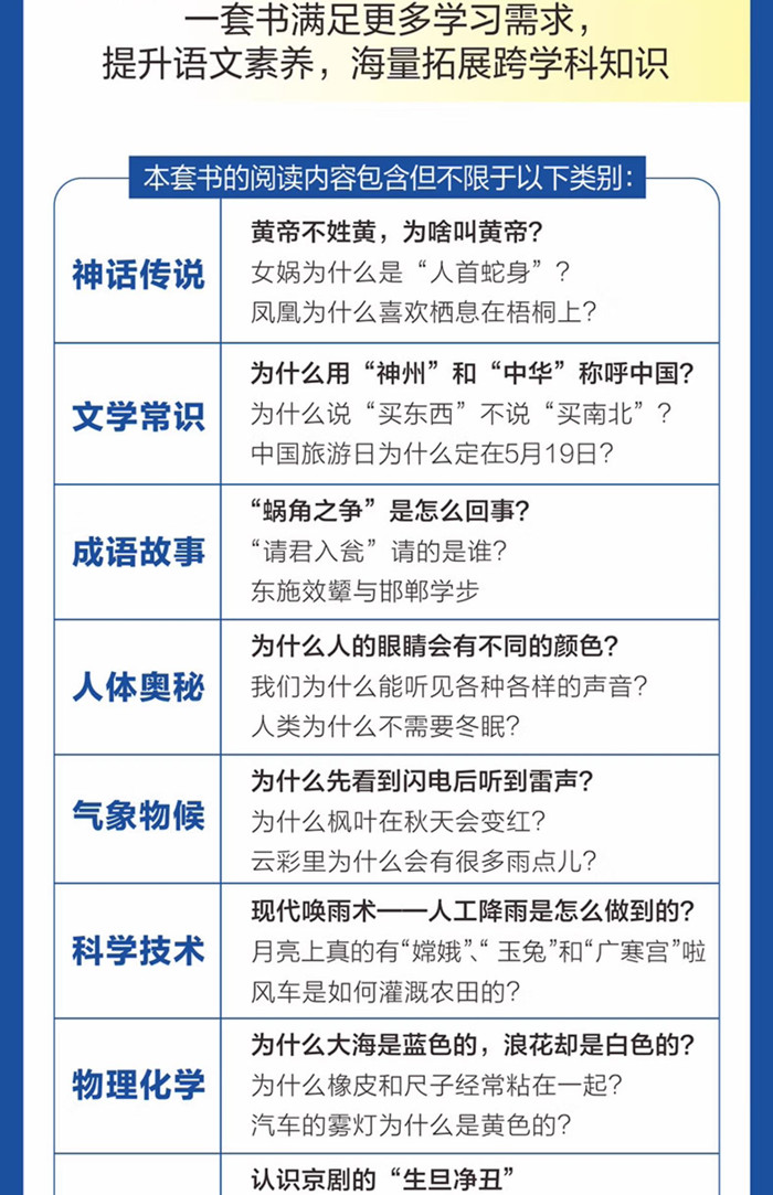 1.课本里的每个疑问,这里都有答案。紧紧围绕课文,深度挖掘教材内容,帮助学生读懂、读透教材。教材+拓展,既不脱离单元分类,又能在海量的多学科阅读中拓展视野、扩大知识面,实实在在提升综合素养。 2.趣味问答,问题以小见大、深入浅出,新颖有趣,激发孩子好奇心,让孩子轻松阅读,爱上语文。 3.从科普、文化、地理等视角带领学生拓展视野,一套书提升多学科学习能力,满足更多学习需求。 4.图片多采用实景图、馆藏图、摄影图等,每个图片都是一个小知识,图文结合更好读。 5.全彩印刷,一二年级正文部分全部注音,低年级可自主阅读。全部采用国标大字号,保护孩子视力。 ❤同步语文课本,深度挖掘教材内容,帮助学生读懂读透教材。 ❤一问一答,课本里的每个疑问,这里都有答案。孩子不知道的、想知道的、该知道的统统在这里。 ❤语文文化常识+自然科学启蒙,海量拓展跨学科知识,帮助学生增...