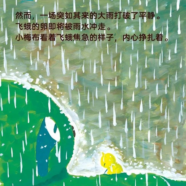 住在森林里的树懒小梅布非常懒散,他连动都不想动,甚至头上都长出了嫩芽,身上也爬满了青苔。小鸟儿扔掉的种子成了他的食物,飞蛾在他身上筑巢,蝴蝶在他身上休息,小动物们也把他当作游乐园。 然而,一场突如其来的大雨打破了平静。飞蛾的卵即将被雨水冲走,小梅布看着飞蛾焦急的样子,内心挣扎着:如果还像以前一样,因为自己行动迟缓而无法成功怎么办?最终,内心的善良战胜了不自信,小梅布缓慢而坚定地爬上了树,为飞蛾和它的卵撑起了一片安全的天空。 这一举动不仅救了飞蛾一家,也让小梅布认识到——每个人都有自己的节奏,慢一点,也没关系。