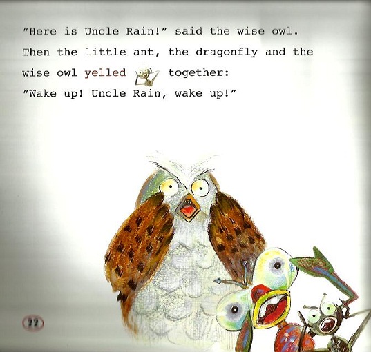 在本书的故事里,美丽的小花口渴了,她们好需要“雨叔叔”,所以想找小蚂蚁帮忙,但是他太小了,没办法找到雨叔叔,于是,找蜻蜓帮忙;热心的蜻蜓也没办法找到雨叔叔,但是他知道可以找聪明的猫头鹰想办法;猫头鹰却说:“雨叔叔在睡觉!”于是,他们一起去叫醒雨叔叔,终于得到他们想要的雨水。最后,小花好快乐,小动物们也跟着高兴起来!