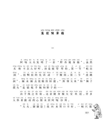 阿嗡大夫发明了一套“野兽健身操”。虽然名称不怎么好听,却是挺管用的。第一节“蛇出洞”,扭啊扭的先活动一下腰部;第二节“虎跳涧”,蹦来蹦去使腿部轻捷;“熊掰玉米”和“狮子摆头”是锻炼手腕和脖子的……