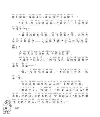 阿嗡大夫开始指挥:“一齐用力,一,二——三!好,下床了。现在来做第一节操。老丈人——我应该叫‘懒汉的老丈人’,为方便起见,也就用简称了——老丈人,您把3号绳和4号绳提一提。大舅子和小舅子,你们把7号绳和9号绳松一松。小姨子,让你姐夫的脑袋朝左转90度——哎呀,你自己怎么摔下去啦!”