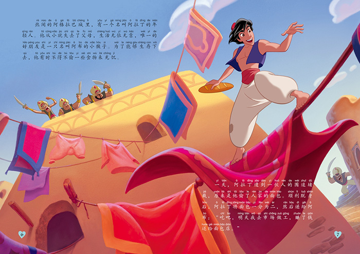 这是一本图画故事书。故事中,有一个生活在社会底层的年轻人,名叫阿拉丁,他虽然贫困潦倒,但却有一颗金子般的心。在瘦弱的小姑娘受到欺负时,他能够挺身而出,仗义执言。直到有一天,他遇到了自己的真爱天女,茉莉公主,为了帮助茉莉公主脱身,也为了追求自己的爱情,他勇敢地与魔法师斗智斗勇,最终在灯神的帮助下,终于战胜敌人,同时也解救了茉莉公主。