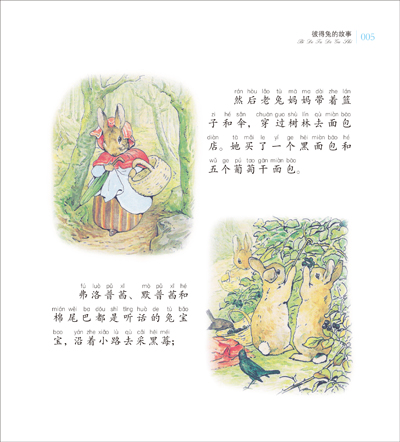 然后老兔妈妈带着篮子和伞,穿过树林去面包店。她买了一个黑面包和五个葡萄干面包。弗洛普茜、默普茜和棉尾巴都是听话的兔宝宝,沿着小路去采黑莓。