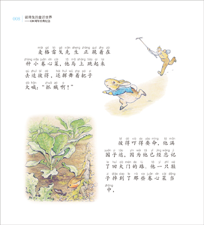 麦格雷戈先生正跪着在种小卷心菜,他马上跳起来去追彼得,还挥舞着耙子大喊:“抓贼啊!”
