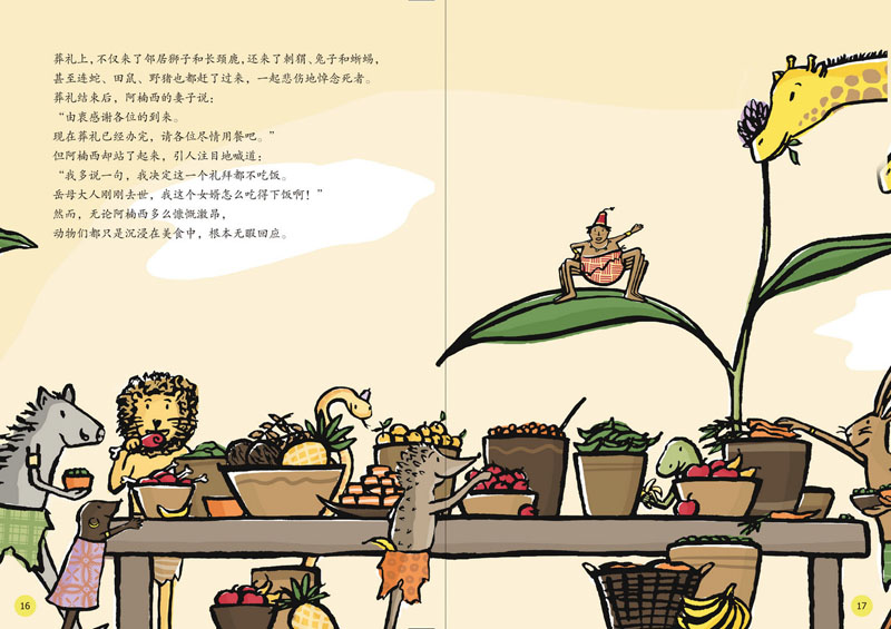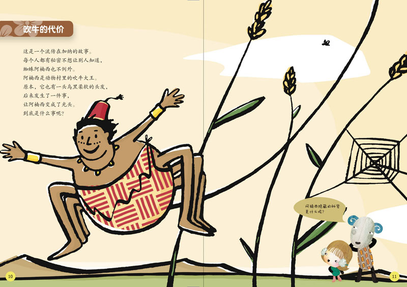 这是来自加纳的童话故事,本书的插画结合了电脑绘图(Photoshop)及手绘,以特殊的粗边轮廓及单纯的平涂上色,吸引读者目光。人物造型活泼、肢体线条自然,生动地表现出谐趣的故事情境。
