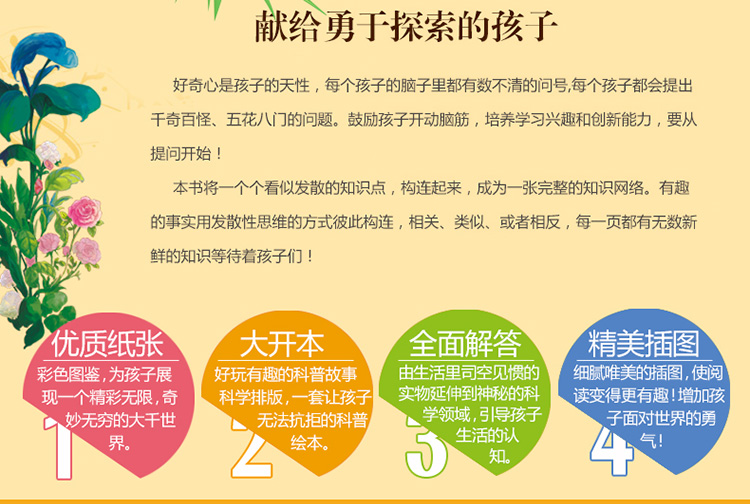 1. 全面解答:由生活里司空见惯的实物延伸到神秘的科学领域,引导孩子生活的认知