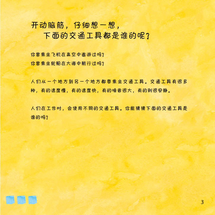 《这是谁的交通工具》从工作中使用的交通工具这个视角,向小读者娓娓道来各种从业人员的职业和工作内容,包括七个职业。先通过呈现某一从业人员所使用的交通工具的细节图片,让孩子猜测“这是谁的交通工具?”然后在下一页呈现整体图片,在揭晓答案的同时阐述了具体的工作名称、工作内容以及这些交通工具的名称及用途。另外,还列出了每种交通工具的一个有趣事实。另外,书后包含一个小测试,让孩子根据从业者的职业话语,指出对应的细节图片,检测孩子从本书学到的职业知识。最后还提供了一些推荐读物和网络资源,利于孩子进一步探索感兴趣的相关职业。