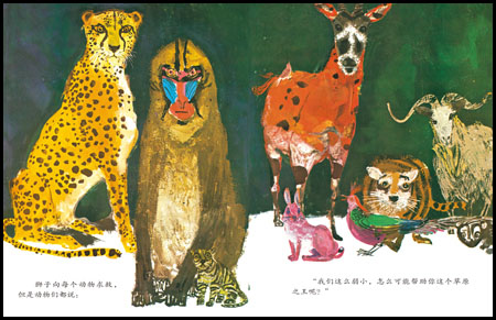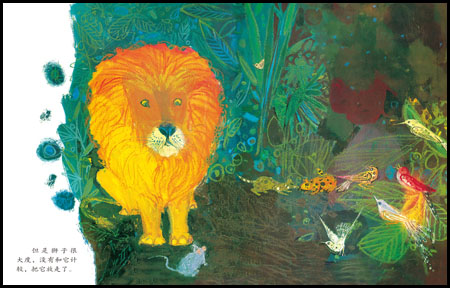 本书《狮子和老鼠》是大家耳熟能详的故事,由英国插画家布莱恩•威尔史密斯(Brian Wildsmith)根据拉封丹的寓言诗《狮子和老鼠》进行改编和绘画。 有一天,小老鼠踩了狮子一脚,狮子不但不计较,还把老鼠给放走了。老鼠感恩地表示,以后如果狮子有困难,一定会报答他,狮子认为自己是勇猛的动物之王,不指望老鼠会给自己什么帮助。几个月后,狮子不小心被一张网困住了,动物们听到狮子的求救声,却无法帮忙他,这时候,小老鼠来了,他一点一点地把网咬破,终于把狮子救出来了。拉封丹的寓言诗一向富有戏剧性,情节时而冲突激烈,时而跌宕起伏,加上细腻的心理描述,使短小的寓言更富有史诗的色彩和哲学家的智慧。而本书经过布莱恩改编后的内容更是简洁生动,便于朗诵和记忆,尤其是他运用水彩、粉彩、拼贴等多种表现手法,自由大胆地构图和变形,使画面充满了童趣和华丽的美感,适合朗读、表演和欣赏,也适合应用在艺术教育领域上。
