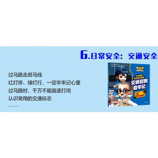 《皮皮鲁安全特工队安全教育贴纸游戏故事》是根据《皮皮鲁安全特工队》动画片内容打造的儿童安全教育读物,配贴纸游戏进行互动,适合3-8岁儿童使用。故事选取8个安全教育方面具有代表性的知识点:“用电安全”“火灾逃生”“校园暴力”“交通安全”“防诱拐” “高处安全”“戏水安全”“细菌病毒”。8本书解锁120+条安全知识,故事贴近儿童生活现实情况,结合时代发展,从身边小事培养安全意识,发现家长都忽略的部分。既然无法保护孩子一生,不如教会他如何应对危险,远离伤害。 日常安全:《交通规则要牢记》 过马路走斑马线; 红灯停、绿灯行,一定牢牢记心里; 过马路时,千万不能追逐打闹; 认识常用的交通标志……