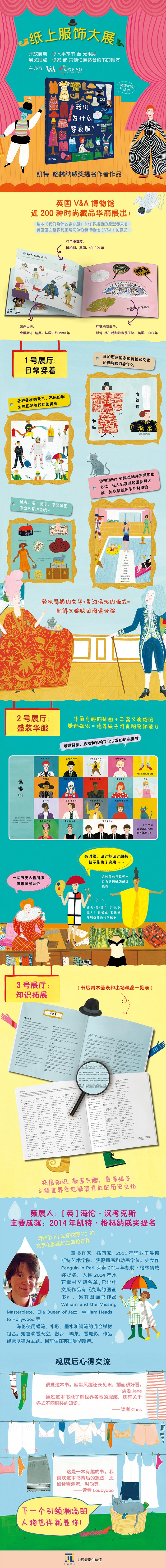 你知道吗?你现在穿的衣服可以透露你的祖先是谁;在人们发明轻薄凉爽的面料之前,泳衣居然是羊毛材质的!从帽子到鞋子,从日常穿着到盛装华服,服饰可以帮我们应对天气变化、表达自我……下一个引领潮流的人物也许就是你! 新锐童书作家、插画家海伦·汉考克斯的文字轻快简短,生动讲述关于服饰的一切。以英国V&A博物馆近200种时尚藏品为原型的插图华丽有趣,赋予文物崭新的生命。一场迷人的纸上时尚盛宴拉开帷幕,培养孩子对美的感知能力、了解世界各地服装背后的历史文化。