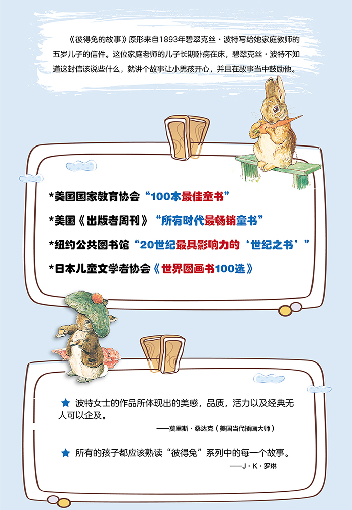 《彼得兔的故事》是碧翠克丝·波特的*本童书,初版于1902年。故事原形来自1893年碧翠克丝·波特写给她家庭教师的五岁儿子的信件。这位家庭老师的儿子长期卧病在床,碧翠克丝·波特不知道这封信该说些什么,就讲个故事让小男孩开心,并且在故事当中鼓励他。一百多年过去了,这只淘气的彼得兔从麦格雷戈先生的菜园中逃脱的经典故事依然带给全世界小朋友无比欢乐,就像*初带给*批读者一样