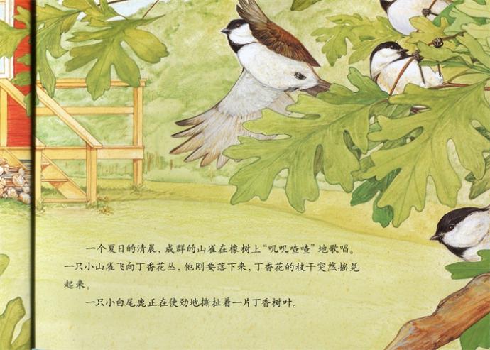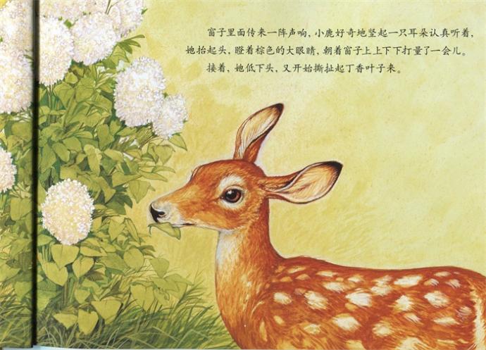 小鹿冒冒失失地闯进了农家的院子,她喜欢院子里丁香花的味道。可是房门突然打开了,妈妈吓坏了,她带着小鹿飞快地跑进森林里。