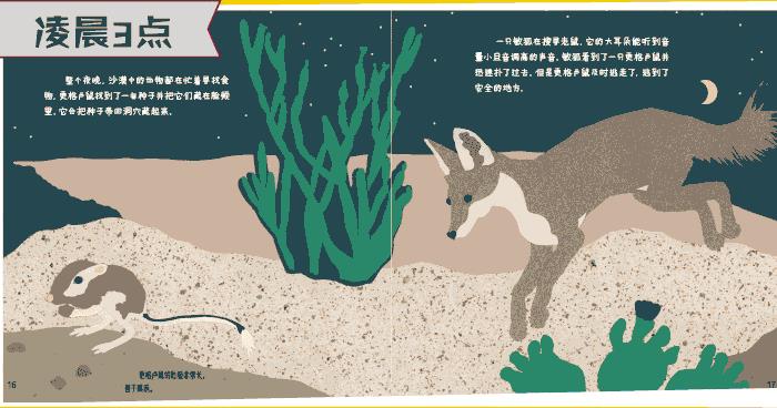 你是怎样度过你的24小时的呢?你在吃饭、学习、玩耍的时候,大自然里的动物们又在做什么呢?本套丛书分别介绍了生活在森林、热带雨林、沙漠以及北美草原四个不同的自然环境中的动物们一天之内的活动情况。不仅可以让小读者了解到地球上截然不同的自然环境的地理特点和气候特点,以及动物们是如何适应这样的环境的,同时,还可以了解昼行性动物和夜行行动物不同的生活习性。