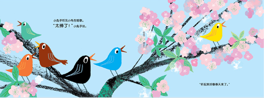 这一天,当他听见小鸟歌唱,闻到鲜花的芳香,看见草地上的绵羊,啃着鲜嫩的青草,踩着温暖的大地,他终于和朋友们欢呼:“春天真的来了!”