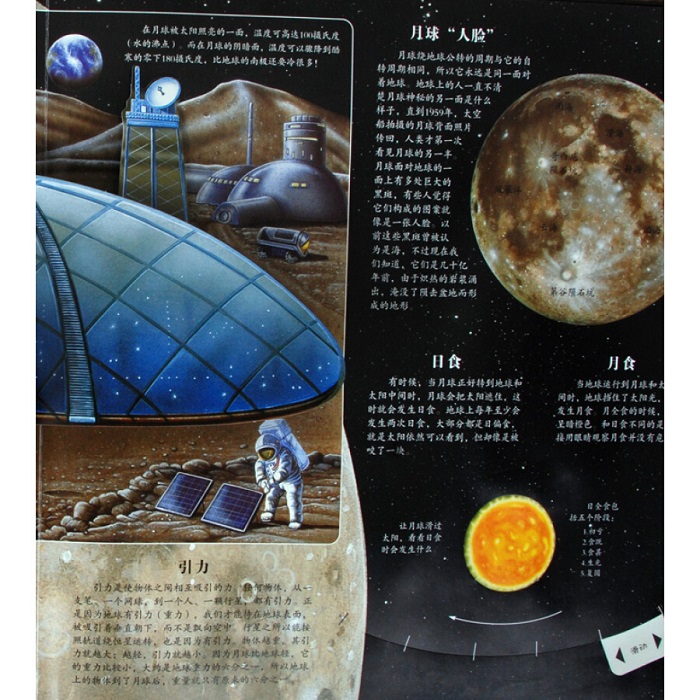 《太空》从星罗密布的地方启程,一直到达宇宙的边缘。本书含有多个立体形象,还有超立体的太阳系,拉拉式的彗星,月相,极为壮观的超新星爆炸图,这将是一场有趣又新奇的冒险。将带孩子进行一次宇宙之旅。而且书中各种有趣的互动方式:翻页、小册子、弹跳力体、拉拉页、纸艺立体模型等带我们追随着人类探索太空的足迹,走过一个个以现代和未来航空航天为主题的场景,体验波澜壮阔的太空旅程!在这里你可以置身浩渺宇宙,触摸那遥远而又神秘的星球,也可以翱翔天际,体验一场难忘的太空之旅!让孩子在进行宇宙之旅的同时,兴致盎然的探索太空的奥秘!宇宙中有什么?地球的结局会怎样?月球上有水吗?太阳系的行星各自有什么“秉性”?不同的恒星会经历怎样的演化历程?系外行星上有生命生存吗?等各种知识等待着小读者前来探索!