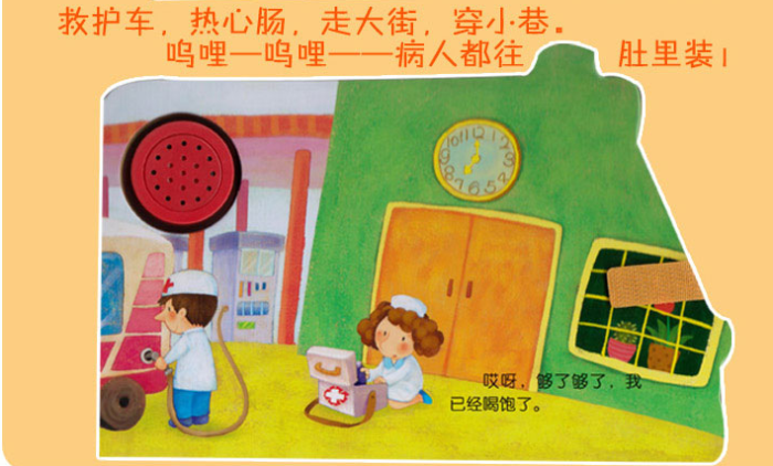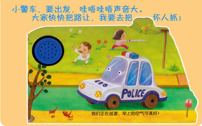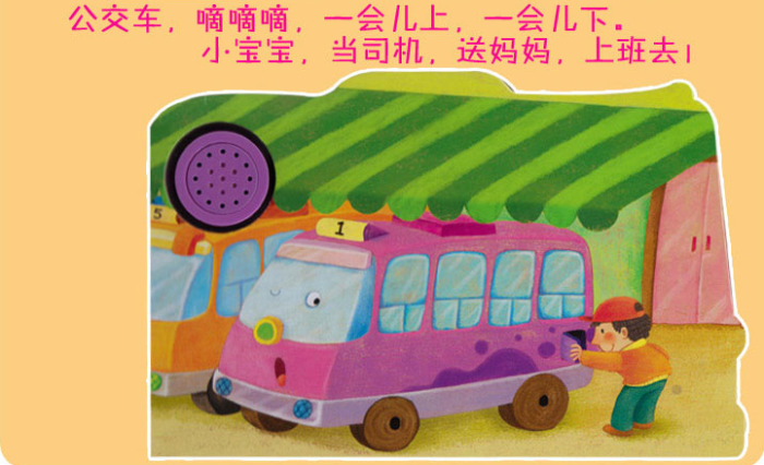 本书是图画故事书,车轮可以转动,厚纸板撕不烂,图书中讲述了这些载运工具一天的忙碌生活。