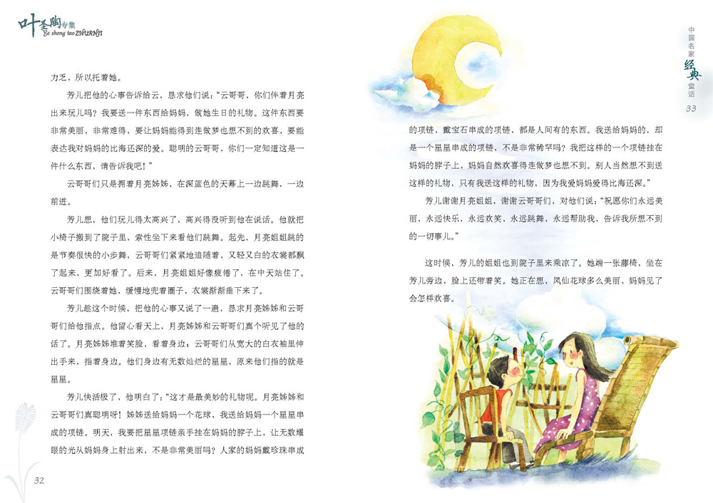 月亮只是对着芳儿微笑。她越走越近了,全身射出活泼的光。月亮身边浮着些儿淡淡的微云,他们穿着又轻又白的衣裳,飘呀飘呀,好像跳舞的女郎。他们怕月亮寂寞,所以陪着她;他们怕月亮力乏,所以托着她。芳儿把他的心事告诉给云,恳求他们说:“云哥哥,你们伴着月亮出来玩儿吗?我要送一件东西给妈妈,做她生日的礼物。这件东西要