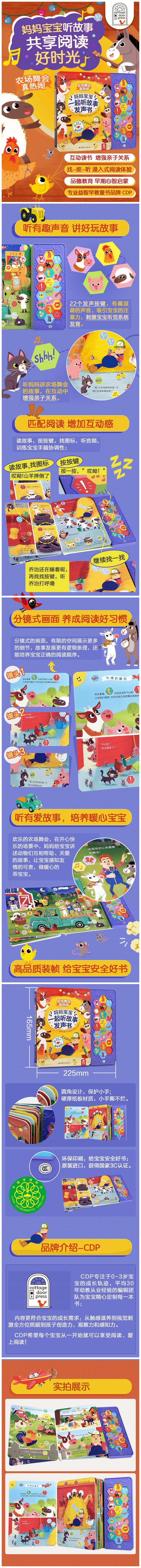 本系列书共2册,分别是《农场舞会真热闹》《生日派对真有趣》。本册书讲的是快乐的舞会要开始了,农夫却呼呼大睡,于是动物们齐心协力地忙活起来,打算给农夫一个惊喜,每一项都井然有序地进行着,猫咪装扮气球、山羊收拾水桶、小鸡运送食物,奶牛呢?在亲吻亭呢!其他动物在干什么呢......农夫醒来后又发现了什么惊喜?一起来看看吧!整个故事诙谐趣味,文中插入音效图标共90个,并搭配22个发声按钮,让孩子自己边读故事边听音效,一边享受互动式的阅读时间,一边在匹配按钮的过程中提升自己的手眼协调性和倾听技巧,培养孩子的专注力、想象力,开发孩子记忆力和语言表达能力,故事氛围更浓厚。漫画风格的排版设计呈现出分镜式画面,视觉刺激也更丰富。让孩子在书中探索和发现更精彩的世界吧!