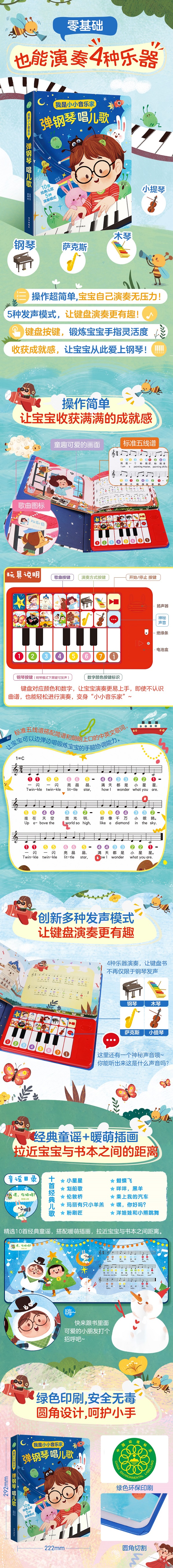 ①精选10首耳熟能详的经典儿歌,家长也能跟着哼唱。让家长和孩子一起,享受温馨的亲子时光; ②按一按就能听到完整的儿歌发音,即使孩子不会演奏,也能听到优美的音乐,培养孩子的乐感; ③键盘对应颜色和数字,让孩子在演奏时更易上手,即使孩子不认识曲谱,也可以轻松进行演奏。 ④除了传统钢琴发声以外,还有另外三种乐器发声,风别是木琴、萨克斯和小提琴,让孩子感受不同乐器带来的不同演奏效果。还有一种神秘发声,带给给孩子更多惊喜。 ⑤扫描封底二维码,还能听儿歌童声演唱。孩子可以看着内文歌词一起跟着唱,锻炼孩子的节奏感。