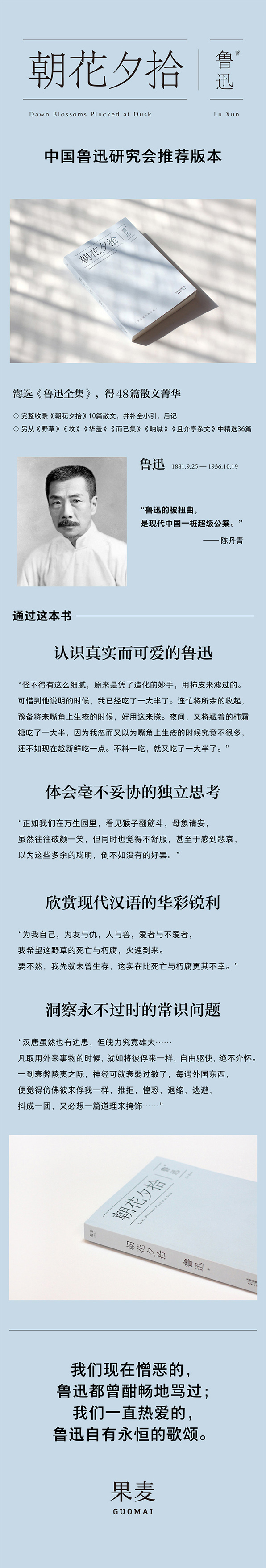 鲁迅作品,历来总是强调其战斗的一面,而忽略他文学中闲适的一面,优美的一面,甚至游戏的一面。新版《朝花夕拾》精选鲁迅先生48篇优美有趣的散文,全书分为四部分:*部分《朝花夕拾》,儿时美好记忆牵挂一生;第二部分,选取鲁迅先生随手拈来美文小品,余闲时,赏玩风筝、秋叶、江南雪;第三部分,看先生风趣妙谈古今历史;第四部分,记忆中的那些人那些事,在先生笔端随波荡漾,静谧安好。请阅读这些鲜活的文字,认识一位活生生的鲁迅,欣赏他的好玩,丰富,优美,温柔。