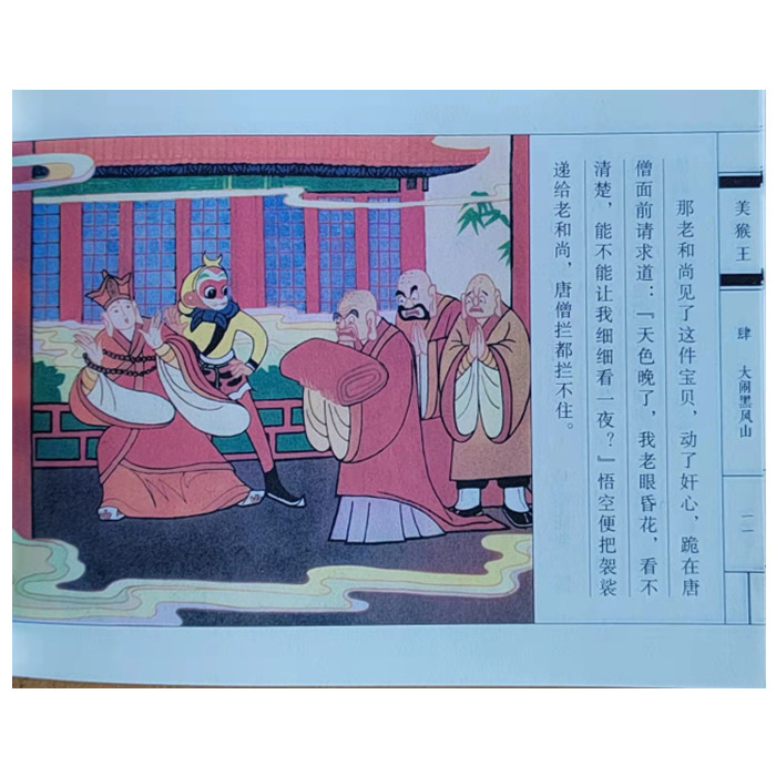“美猴王”连环画版是“美猴王”系列产品之一,内容从“猴王出世”“大闹天宫”开始,到唐僧师徒四人*终实现 “取经归来”结束,是广大青少年读者耳熟能详的传统文化经典,且情节比较完整。本书采用64开彩绘连环画的形式,具有小人书的怀旧风,又有彩色儿童美术作品的唯美风格。版面仿照雕版书样式,古朴可观。文字精当,直白浅显而不乏原著神韵,方便儿童阅读。