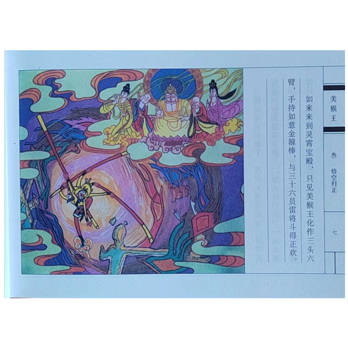 “美猴王”连环画版是“美猴王”系列产品之一,内容从“猴王出世”“大闹天宫”开始,到唐僧师徒四人*终实现 “取经归来”结束,是广大青少年读者耳熟能详的传统文化经典,且情节比较完整。本书采用64开彩绘连环画的形式,具有小人书的怀旧风,又有彩色儿童美术作品的唯美风格。版面仿照雕版书样式,古朴可观。文字精当,直白浅显而不乏原著神韵,方便儿童阅读。