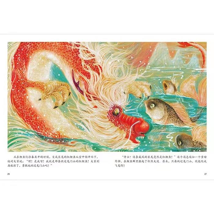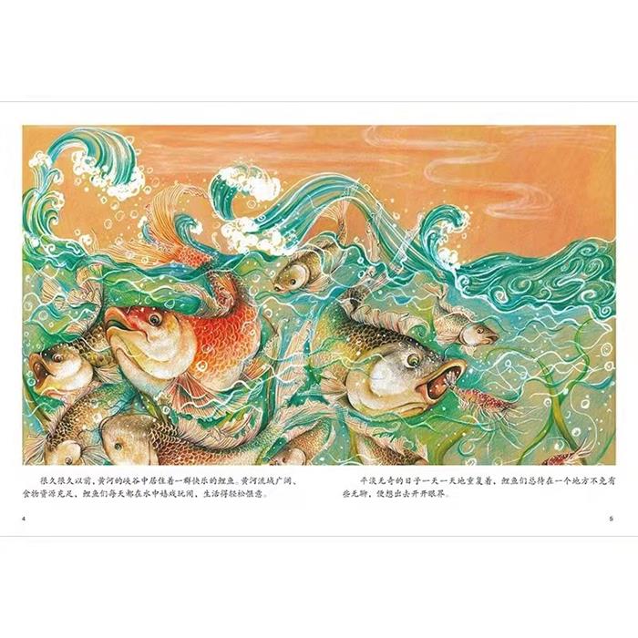 红鲤鱼一呼百应,鲤鱼们组成了声势浩大的队伍,浩浩荡荡地游往龙门山。 沿途的一切对于鲤鱼们来说都那么新奇:鹈鹕们在渔夫的渔船上欢快地拍打着翅膀,像是翩翩的舞者:两岸巍峨的青山,仿佛士兵一样守卫着黄河;天空中闪耀的云霞,像有着绚丽光彩的宝石……真是好景致啊!