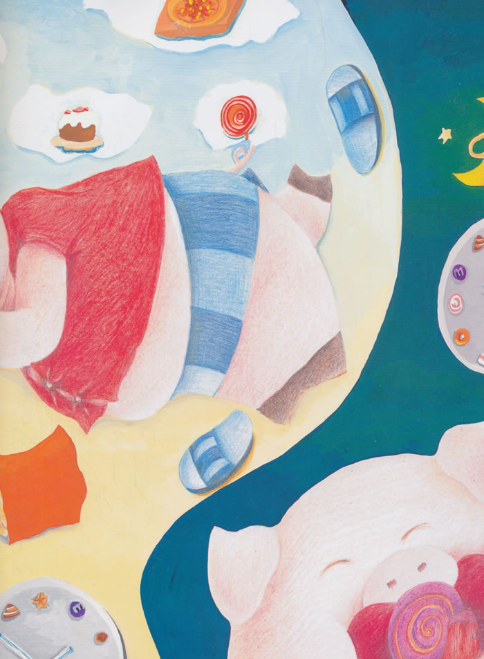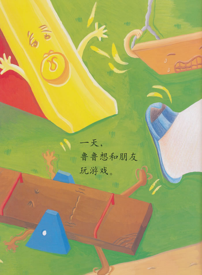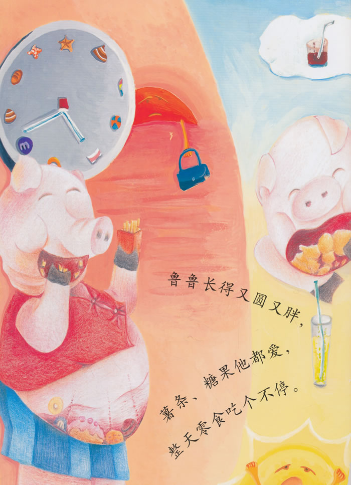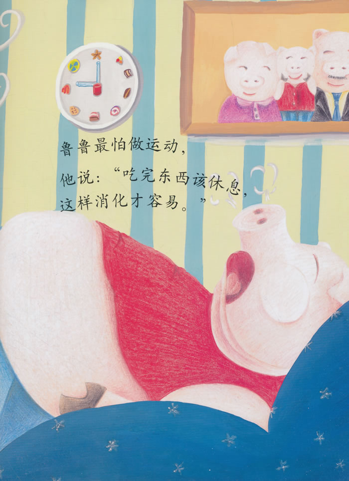 小猪鲁鲁太胖了,荡秋千时秋千绳断了,滑滑梯时卡住了屁股,玩跷跷板时跷跷板一动也不动,鲁鲁伤心得哭了。还好这只是一场噩梦,鲁鲁决定今后少吃零食、多运动!