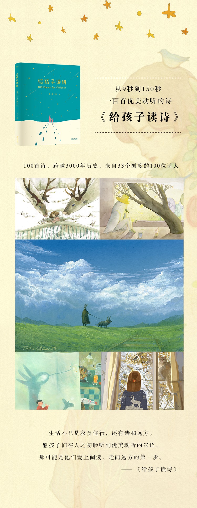 《给孩子读诗》中的一百首诗,跨越三千年历史,来自33个国度的100位诗人。在这里,泰戈尔、木心、聂鲁达,谷川俊太郎、胡适、李叔同,普希金、苏轼、史蒂文森,莎士比亚、丰子恺、安徒生……乃至无名的爱斯基摩人,排名并没有先后之分。全书含中国古诗25首,中国近现代作品24首,外国诗歌51首。外国诗歌由39位杰出翻译家提供译本;每一首诗均配有美丽的插图,由世界各地70位画家创作。