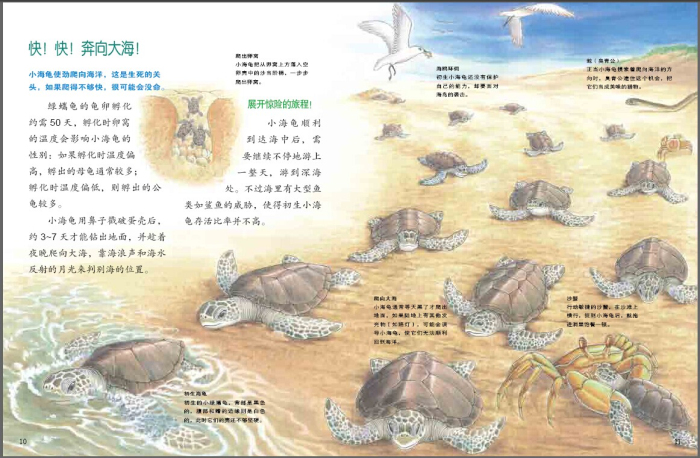 在寓言故事里,有一只乌龟和一只骄傲的兔子赛跑。竞赛中乌龟很守本分,它努力地往前爬,*终赢得了胜利。其实在真实的自然界中,也有一场场激烈的竞赛等着小海龟上场。由于海鸟的掠食等其他原因,只有70%的海龟卵可以顺利孵化。刚孵化的小海龟奋力地爬出洞口,借着海面亮光的指引,成群结队地朝大海爬去。它们必须快快地爬,因为,这次它们是在和海鸟的尖喙、螃蟹的利爪比速度。可惜的是,在这短短的赛程中,大多数的小海龟都输了。更遗憾的是,有些海龟好不容易逃过自然界中的天敌,却躲不过人类的伤害。生命是可贵的,希望借本书让大家体会到每个生命都是得来不易的。所以,请珍惜自己的生命,珍惜别人的生命。