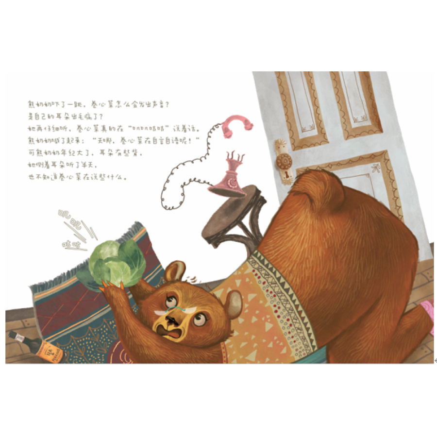 熊奶奶从地里摘了一棵卷心菜,正要拿到切下去,却听到卷心菜发出“叽叽咕咕”的声音,这可把熊奶奶吓坏了。熊奶奶年纪大了听不清卷心菜在说什么,于是喊来了河马先生帮忙,河马先生认为卷心菜里有一只想游泳的小鱼。熊奶奶又去找了兔子先生,兔子先生却认为卷心菜里是一只想吃花蜜的小蝴蝶。他们争论不休,这时来了一位青蛙大婶,她拿起卷心菜好奇地听了听,突然哭了起来……原来卷心菜里藏着青蛙大婶失踪两个月的宝贝小青蛙。熊奶奶为了庆祝青蛙大婶找到了自己的小宝贝,赶紧用卷心菜熬了一锅汤,请大家一起吃。青蛙大婶终于和自己的小宝贝团聚,他们高高兴兴地回家了。