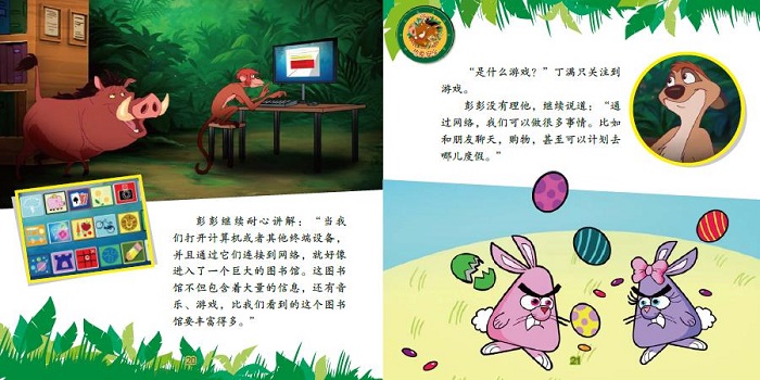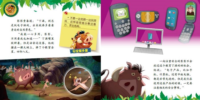 本套丛书共6册,主题分别是居家安全、身体安全、网络安全、环保安全、用火安全和安全玩水。除了普及传统意义上的安全知识外,还加入了“环保安全”这种近些年被广泛关注的、与生活息息相关的新的安全概念。教会孩子不仅关注自身,还能用发展的、前瞻性的眼光看待周围的世界。故事采用了迪士尼著名动画电影《狮子王》里的丁满和彭彭两个角色,讲述他们生活中的各种趣事。丁满性格大大咧咧,常常做出不安全的举动;彭彭性格谨慎稳重,总是适时提醒丁满,避免酿成大错。两个性格差异如此之大的好朋友总是火花不断,但也在笑笑闹闹中学会了安全知识。