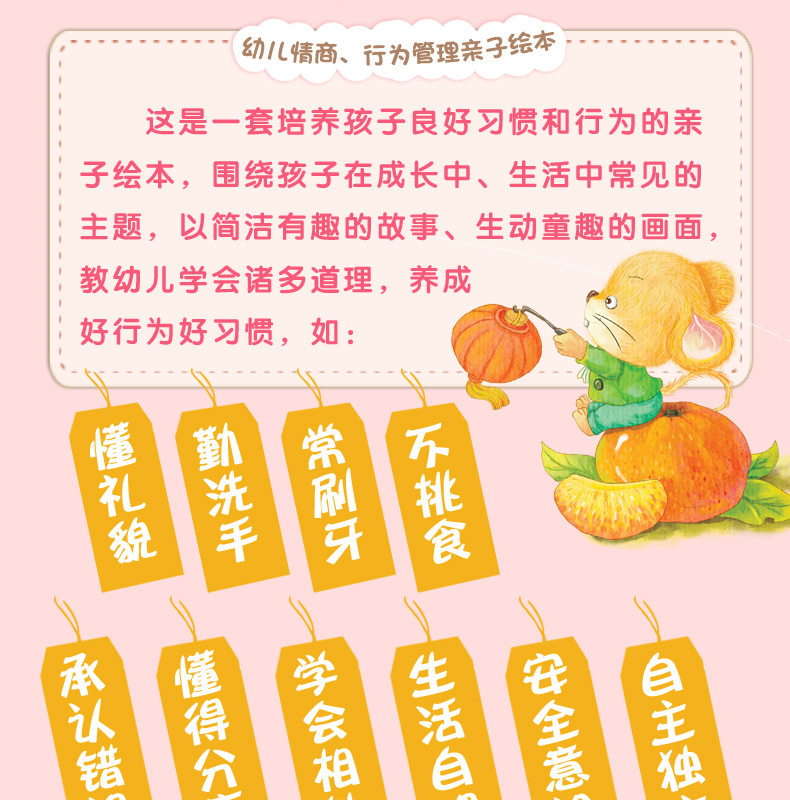 这是一套培养孩子良好习惯和行为的亲子绘本,围绕孩子在成长中、生活中常见的主题,以简洁有趣的故事、生动童趣的画面,教幼儿学会很多道理,养成好行为好习惯。