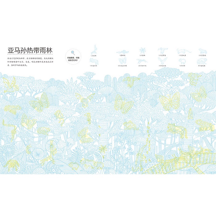 这是一本给2~6岁孩子的双色找找书,每一个跨页都是地球上的一种自然栖息地,里面藏有生活在其中的独特动物。每一页内容均由两种颜色的图层组合而成,需要配合对应的滤镜使用,才能把底层颜色滤掉、显现出图中隐藏的动物。书中介绍了地球上11种自然栖息地和132种栖身其中的独特动物,而动物数量也“藏”有玄机,每页根据各栖息地中实际的物种丰富度有所区别,让孩子在锻炼观察能力之余,也能对该栖息地生态及物种有更直接的认知。