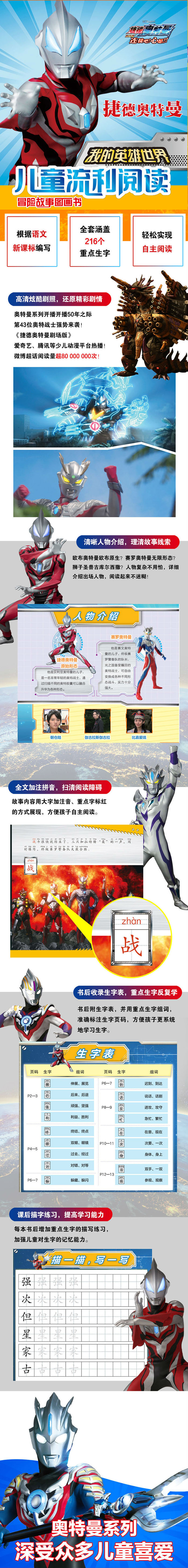 本套捷德奥特曼剧场版《我的英雄世界·儿童流利阅读冒险故事图画书》是专门为孩子打造的识字读物,根据新版小学语文课程标准,严格筛选要求掌握的小学语文教材中的重点生字词,除了精彩有趣的故事外,每册书后都附有重点生字表及其衍生词组,帮助孩子进一步理解生字,提高阅读能力。