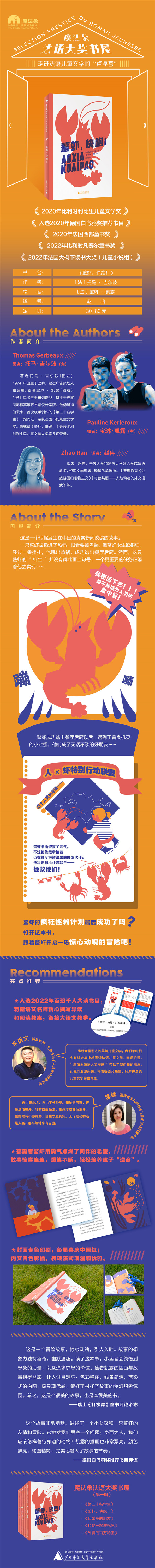 本书荣获2020年比利时利比里儿童文学奖、法国西部童书奖等多项大奖,并入选2020年德国白乌鸦奖,亮点如下:螯虾拯救一群虾蟹小伙伴,重返碧海蓝天,获得自由的故事,将启发孩子们思考,法国18世纪伟大的启蒙哲学家伏尔泰的哲思:为什么我们要尊重所有生灵?虾虾蟹蟹既是我们的食物,同时也是鲜活的生命。我们人类取我们所需,但我们也尽量保护动物生态,让人和动物和谐相处。同时,螯虾千方百计拯救小伙伴的故事,让孩子学会逆商就是办法总比困难多,奇迹总在风雨后。