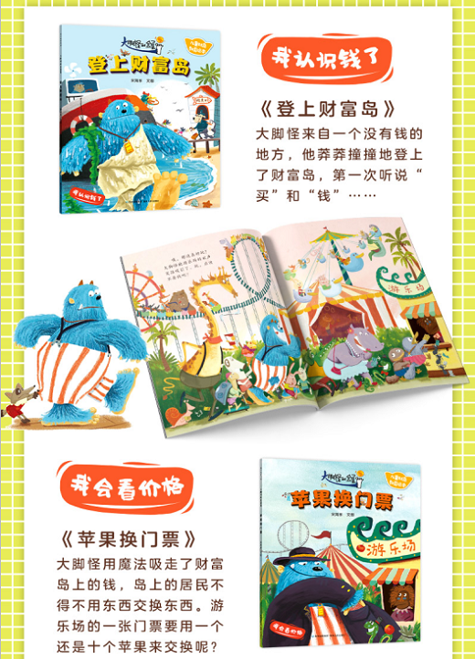 来自没有“钱”的地方的大脚怪,和年龄很小的金蛋蛋,因为不了解等价交换、商品流通的常识,闹出了很多笑话;同时,他们也看到了别人在消费中的一些问题,比如在超市购物的时候,猴子乱抛商品,袋鼠把没付钱的商品放进自己的育儿袋里,孩子们通过阅读,了解了污损商品、未结账就将商品据为己有是不正确的,还懂得了要看清标价、量入为出,在哈哈大笑之后,也会跟大脚怪和金蛋蛋一起学习和进步。