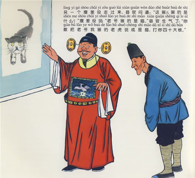 看到县官满脸得意的样子,胖差役吹捧说“真像,跟真老虎一模一样。”于是他得到了十两赏银。瘦差役是个老实人,他直率地说:“画得像猫。”老爷生气了,命人打了他四十大板,疼得他捂着屁股直叫:“老爷,我说的是实主知呀!”