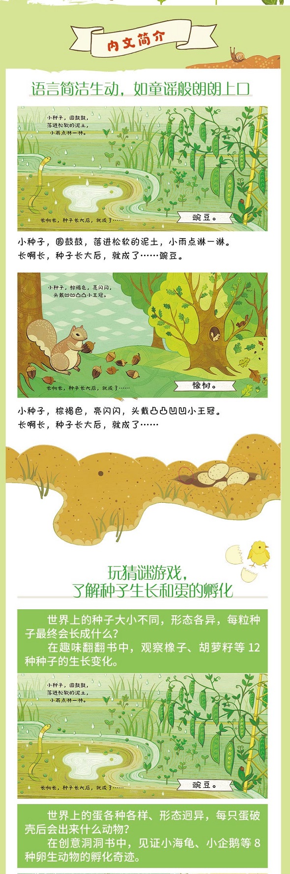这本书以童谣的形式生动介绍了有关卵生动物和蛋宝宝的趣闻,其中的洞洞设计更是新颖别致,童趣盎然。来吧,翻开书,见证蛋宝宝们的生命奇迹吧!