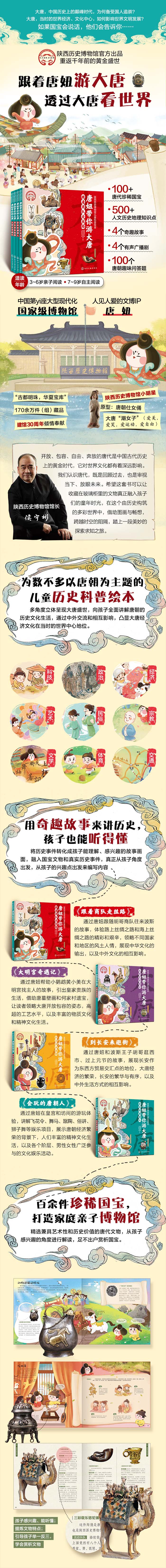 《唐妞带你游大唐》是由陕西历史博物馆官方出品的首套儿童科普绘本,系列内包含四册:《跟着商队走丝路》《会玩的唐朝人》《到长安来逛街》《大明宫奇遇记》,讲述了从陕西历史博物馆盛唐气象馆“复活”的唐代仕女国宝——唐妞,穿越回到唐代长安,与小伙伴们一同开启唐风之旅的奇幻故事。本系列将国宝文物、历史趣事和历史知识融合在故事中,从陕历博藏品特色和孩子阅读认知兴趣出发,在衣食住行的日常生活中展开大唐盛世的画卷,展示中华文化的魅力,激发孩子们热爱历史,以史为鉴,预见未来。提示孩子们在感受民族自豪感的同时继承和发扬民族精神,再创中华文化的辉煌。