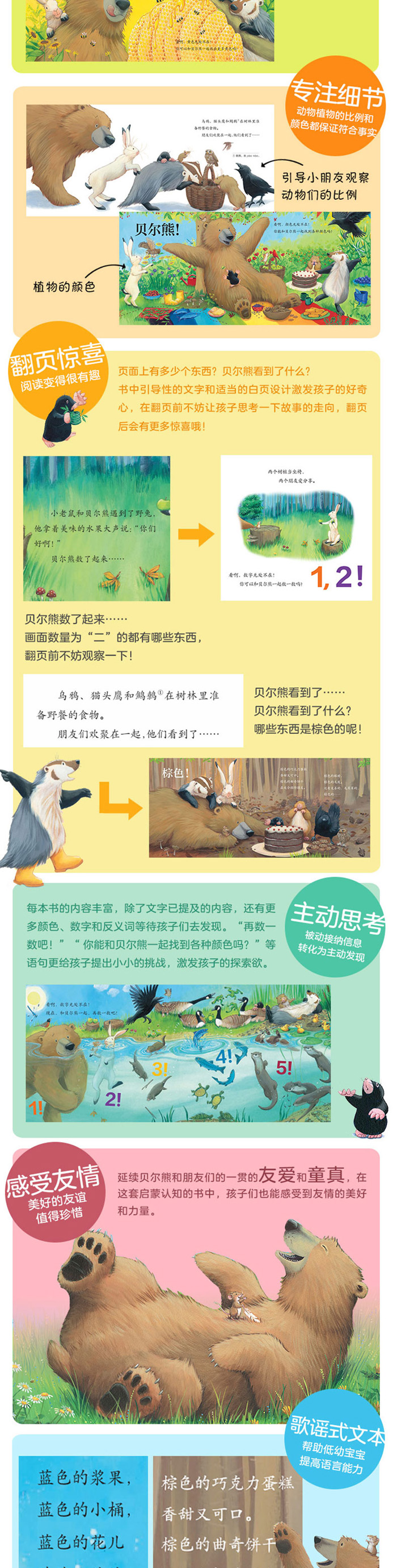 本书为儿童绘本故事(无电子书目)这是一套关于启蒙认知的趣味绘本,该书从贝尔熊身处的环境出发,让小朋友跟着贝尔熊和他的朋友们一起走进树林。或是一起对比大小、高矮和快慢等,学习反义词;或是一起数数,学习简单的数字知识,掌握简单的数数技能;或是从所见所闻中找颜色一样的东西并学会认颜色。