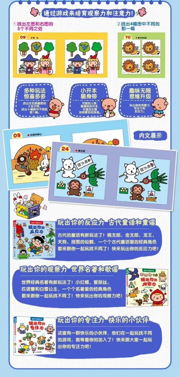 《我的口袋游戏书》系列是一套画风精致可爱的找不同游 戏书,全书共有两种游戏形式:1,找出两幅图的5处不同;2, 找出四幅图中与其他三幅不同的那个。具有良好的娱乐性,每册 都有不同的主题。