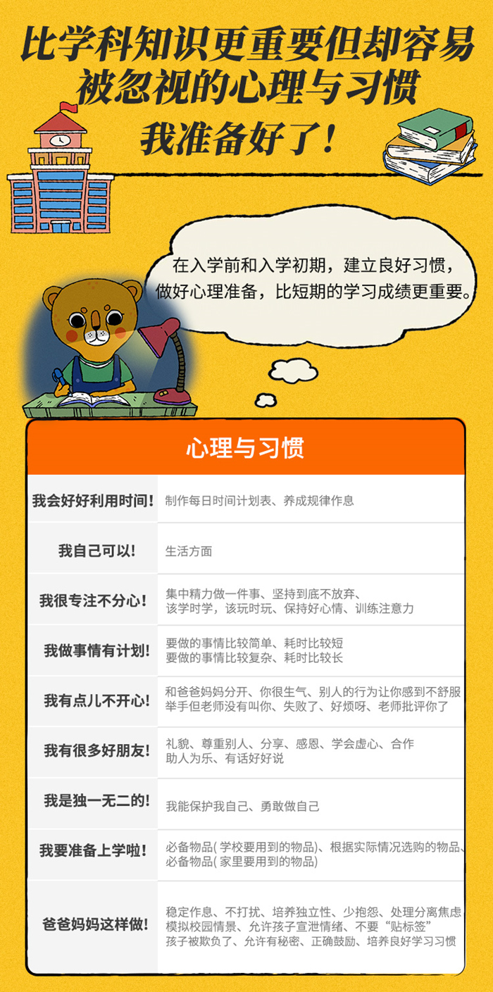 为处于幼小衔接阶段的孩子研发的读物,涵盖数学与思维、拼音与识字、阅读与表达、心理与习惯四个维度。不仅有必备的学科知识启蒙,更有非常容易被忽视其实很重要的心理建设、自控力、社交和生活学习习惯的培养,全方位帮助孩子顺利度过幼小衔接阶段,更好更快地融入小学生活。拒绝揠苗助长式的“提前学习”,采用漫画 游戏题 思维导图的形式,让孩子轻松掌握知识,保护学习兴趣 。