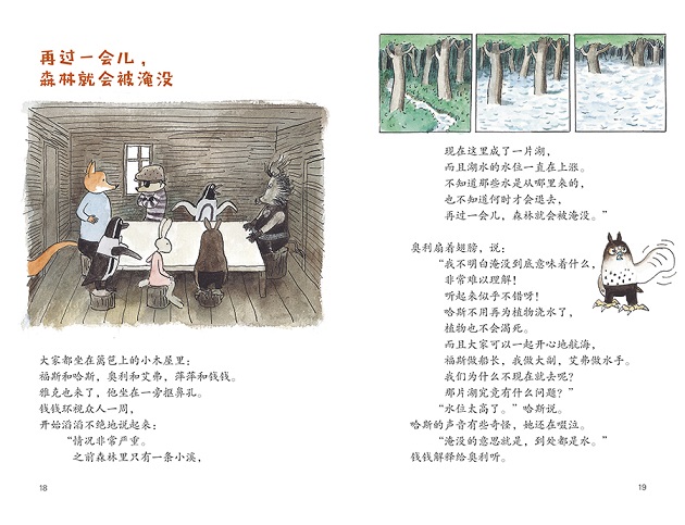 森林里出现了一片海。福斯欢呼:“我们可以在海里游泳了!”但是哈斯说:“这不是海,海水是咸的。这些水是淡水,而且会越来越多。”没错,这是真的,更多的水流到这里,源源不断地流到这里。湖水还在上涨,不断上涨!