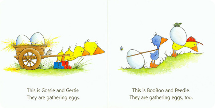 故事的句子短小且重复,语言浅显易懂,时而出现的押韵词朗朗上口。加上纸板设计,开本的大小刚好适合小手把握和翻阅,因此这是一本非常适合低幼宝宝阅读的绘本。