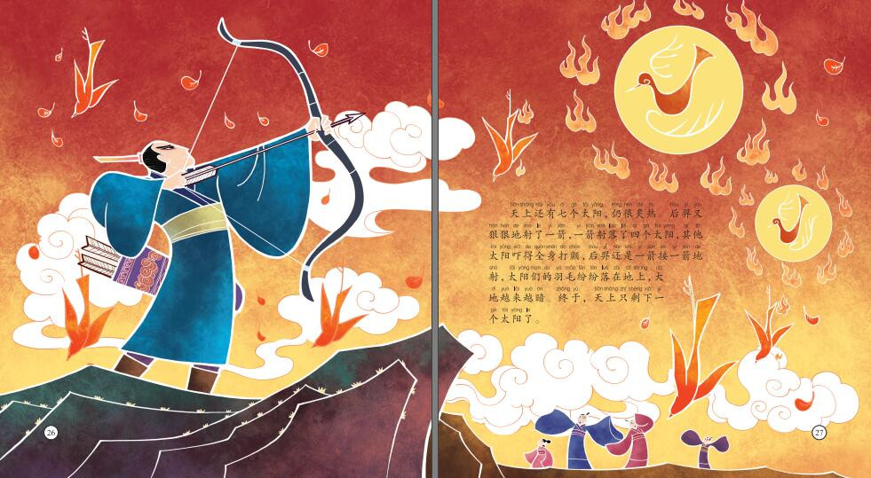 《后羿射日》的传说出自《山海经》《书·尧典》《十州记》《淮南子》《天问》等。讲述了后羿把天空中的十个太阳射掉九个,救人民于水火之中的故事。相传后羿是夏朝东方族有穷氏的首领,善于射箭,民间奉其为“箭神”。