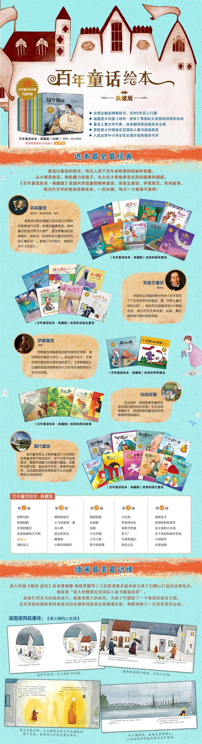 2、 从台湾企鹅引进的这套《百年童话绘本·典藏版》一共5辑,共30个故事,堪称目前国内首套选本*齐全、囊括范围*广的经典童话绘本集。
