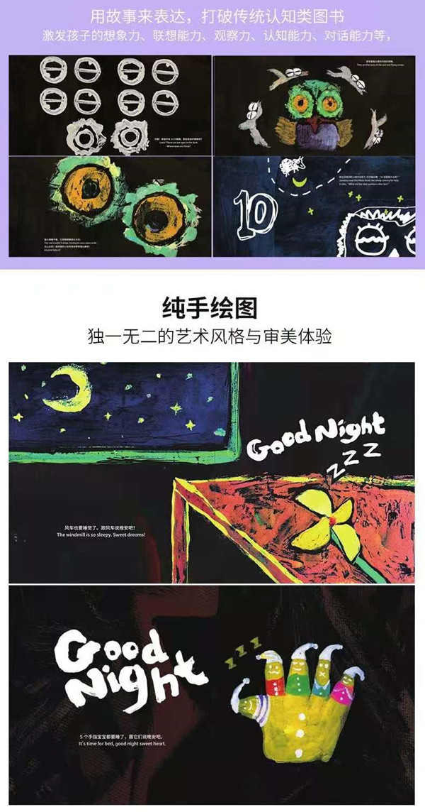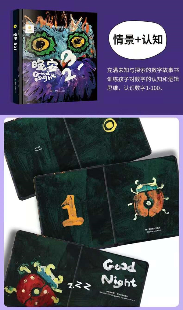 本套书共2册,是面向1~3岁宝宝进行英文字母和数字学习的情境启蒙认知书。全书将简单的故事情节与富有创意的表达形式相结合,没有填鸭式的枯燥感,满足宝宝在这个年龄阶段的基本认知需求。本套书采用了童真童趣的插画风格,符合该年龄段宝宝的审美,并将情感与颜色和认知知识关联,在趣味阅读的同时培养宝宝的读图能力、观察力、想象力和创造力。本书将100个数字串联成一个主题为“晚安”的小故事,故事中包含与数字有关的单词及短句。书中还有模切洞洞、击凸等工艺,让宝宝认数的同时学会点数,锻炼并提升其观察力、想象力和记忆力。