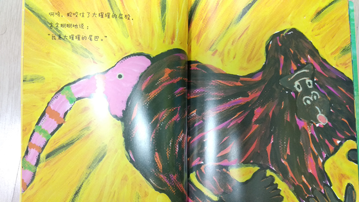 就在这时,一条蛇咬住了它的屁股,蛇含含糊糊地说“我是大猩猩的尾巴!”