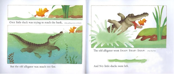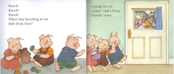 这是一本翻翻书,幼儿在阅读过程中,可以自己打开和关上小猪家的门,可以看看到底是不是猪爸爸回来了,增加了阅读的趣味性。书中的绘画对小猪和野狼这个组合重新做了特别的诠释,将书中各个主角的性格描述清楚,如:小猪们发现野狼的反应,从一开始的惊吓到后来的窃窃私语,以及屡次的不屑神情等。而野狼每次都有不同的装扮来哄骗小猪,比如是开着冰淇淋车,背后却拿了一个网兜;兜风开跑车,背后却藏着大麻袋。